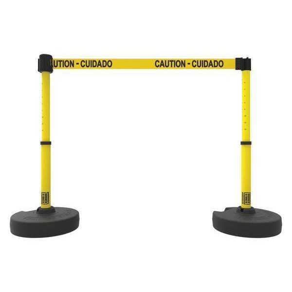 Belt Barrier System, Includes (2) Bases, Receiver Head, Maximum Overall Height 42 in, Minimum Overall Height 22 in, Belt Length 15 ft, Belt Color Yellow, Belt Pattern No Pattern, Legend Caution - Cuidado, Number of Posts 2, Post Color Yellow, Base Type Round Flat, Reflectivity Non-Reflective, Number of Belts 1, Post Height 22 in to 42 in Adjustable, Post Material Plastic, Base Material Plastic