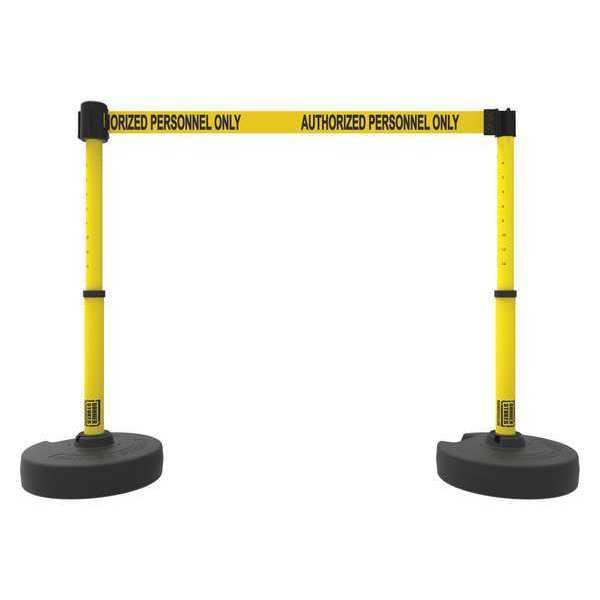 Belt Barrier System, Includes (2) Bases, Receiver Head, Maximum Overall Height 42 in, Minimum Overall Height 22 in, Belt Length 15 ft, Belt Color Yellow, Belt Pattern No Pattern, Legend Authorized Personnel Only, Number of Posts 2, Post Color Yellow, Base Type Round Flat, Reflectivity Non-Reflective, Number of Belts 1, Post Height 22 in to 42 in Adjustable, Post Material Plastic, Base Material Plastic, Package Quantity 2