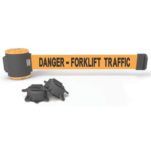 Magnetic Retractable Belt Barrier, Mounting Style Magnet, Belt Length 30 ft, Belt Width 2 1/2 in, Belt Color Orange, Belt Pattern No Pattern, Legend Danger - Forklift Traffic, Legend Color Black, Frame Color Black, Reflectivity Non-Reflective, Overall Height 4 3/4 in, Number of Belts 1, Frame Material Plastic, Indoor/Outdoor Usage Indoor, Outdoor, Includes (2) Suction Cups, Includes Mounting Hardware Included