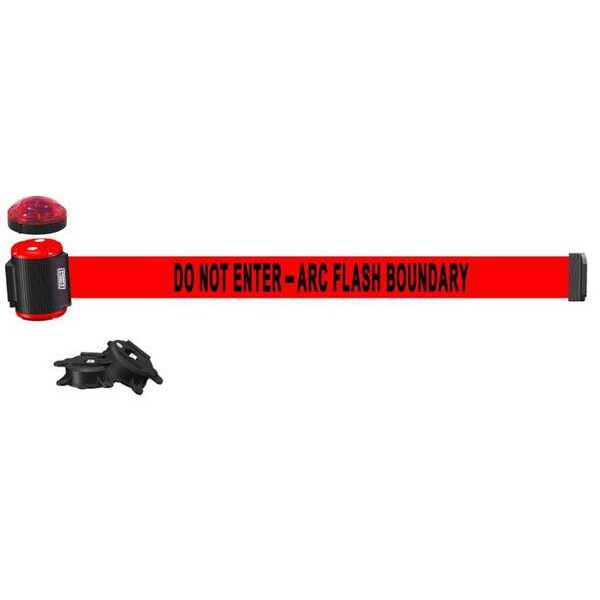 Magnetic Wall Mount Barrier w/Light, Mounting Style Magnet, Suction Cup, Belt Length 15 ft, Belt Color Red, Legend Do Not Enter - Arc Flash Boundary, Legend Color Black, Frame Color Black, Overall Height 5 1/4 in, Frame Finish Matte, Indoor/Outdoor Usage Indoor, Outdoor, Includes (2) Suction Cups, Light Kit with Red Strobe Light, Includes Mounting Hardware Included
