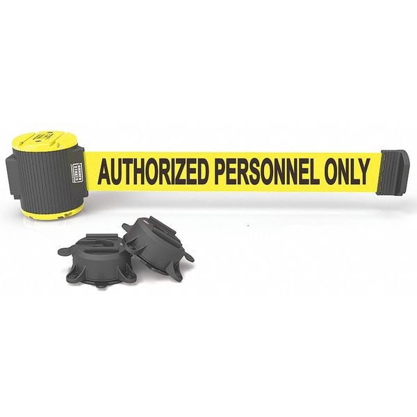 Magnetic Retractable Belt Barrier, Mounting Style Magnet, Belt Length 30 ft, Belt Width 2 1/2 in, Belt Color Yellow, Belt Pattern No Pattern, Legend Authorized Personnel Only, Legend Color Black, Frame Color Black, Reflectivity Non-Reflective, Overall Height 4 3/4 in, Number of Belts 1, Frame Material Plastic, Indoor/Outdoor Usage Indoor, Outdoor, Includes (2) Suction Cups, Includes Mounting Hardware Included