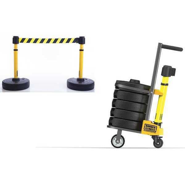 Belt Barrier System, Includes (5) Bases, Maximum Overall Height 42 in, Minimum Overall Height 22 in, Belt Length 15 ft, Belt Color Black/Yellow, Belt Pattern Diagonal Stripe, Legend No Legend, Number of Posts 2, Post Color Yellow, Base Type Round Flat, Reflectivity Non-Reflective, Includes Cart Yes, Number of Belts 5, Legend Color Not Applicable, Post Height 22 in to 42 in Adjustable, Post Diameter 2 1/2 in, Post Material Plastic, Base Diameter 16 in, Base Color Black, Base Material Plastic