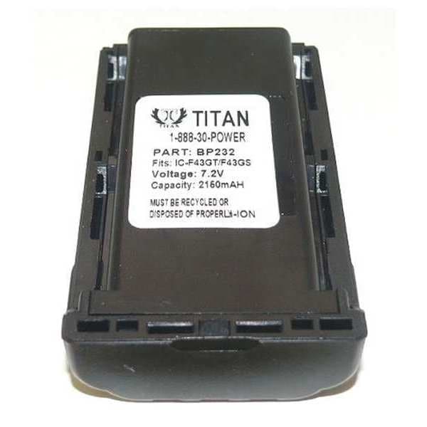 Radio Battery, Product Type Radio Battery, Compatible Radio Type Handheld, Compatible Radio Brand Icom, Compatible Radio Series F14, F24, F33, F34, F43, F44, Compatible Radio Manufacturer Model Number BP232, IC-F14, IC-F24, IC-F33GS, IC-F33GT, IC-F43GS, IC-F43GT, IC-F43TR, Compatible Radio Grainger Model Number Not Applicable, Battery Capacity 2,150 mAh, Battery Type Lithium Ion, Compatible Product Type Two Way Radio, Waterproof No, IP Rating Not Applicable, Voltage 7.2 V, Color Black