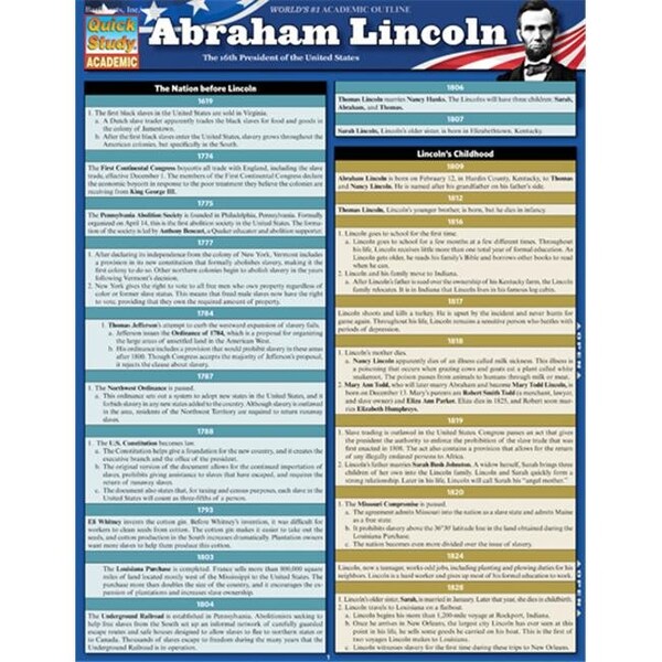 Abraham Lincoln proved to be one of the most defining political figures in American history. Learn more about the life and accomplishments of the 16th president of the United States with BarCharts comprehensive 3-panel, 6 page guide. Each major event concerning Lincoln from his humble upbringing to his untimely death is dated by year and covered in detail. No Lincoln buff should be without this handy reference tool.