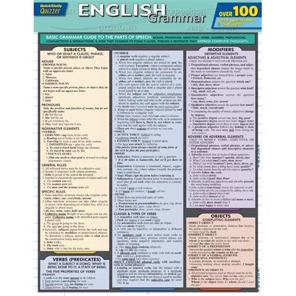 Using the English language while being grammatically correct has never been easier than with the newest 3-panel Quizzers version of our best-selling English Grammar guide. A handy set of questions and answers, found in the back of this edition, thoroughly addresses modifiers, punctuation, clauses, and other elements of grammar that the guide covers in detail. As with the original version, each section is formatted for ease of use so that finding what you need is a cinch.