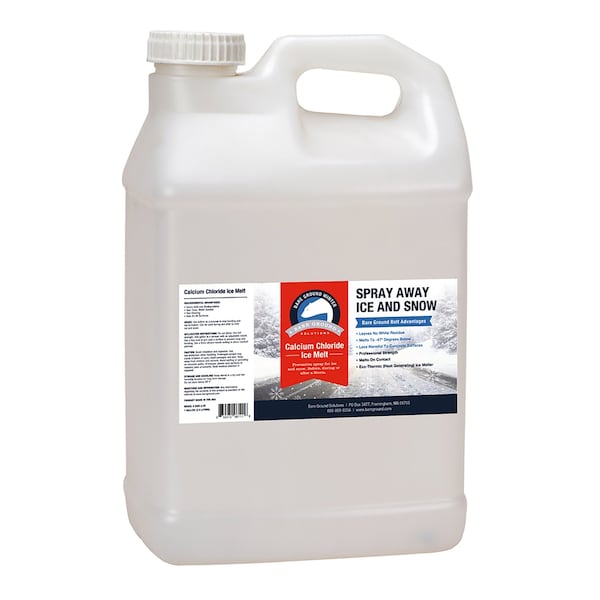 The Bare Ground Bolt liquid Calcium Chloride 2.5 gallon size is perfect for both home and professional use. Calcium Chloride is used by snow removal professionals because it is safe on all surfaces and is the fastest acting ice-melt product available. It is effective at temperatures as low as -20 degrees Fahrenheit. Weighs 30 lbs.