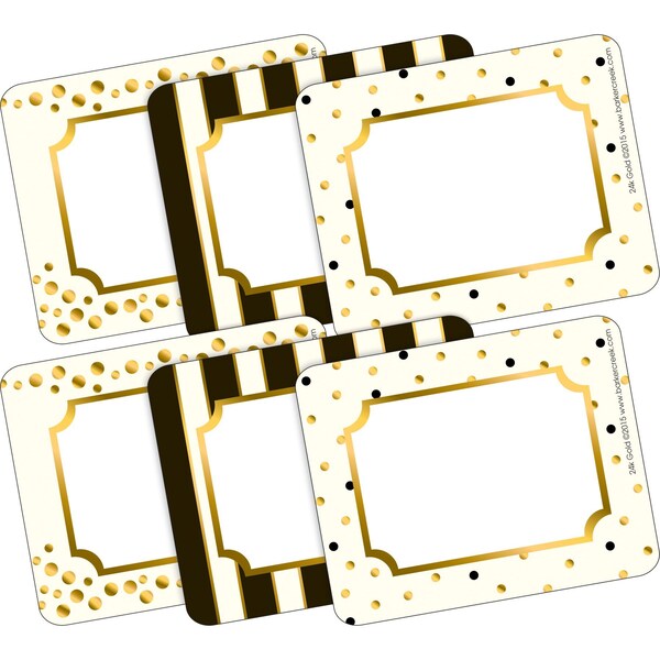Barker Creek's 24k Gold Name tags and selfadhesive labels are perfect for all ages Set includes 90 multipurpose selfadhesive name tags 30 each of 3 designs These name tags are embossed with gold foil These name tags are perfect for the first week of school, field trips, assemblies, special visitors, staff meetings and more They can also be used to personalize file folders, binders, and notebooks The uses are limited only by your imagination These name tags measure 3 12 x 2 34 Coordinating products available Search Barker Creek Gold