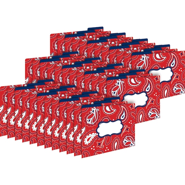 Barker Creek's Bandana LetterSized File Folders are a great way to organize your office, classroom, and home with style There are 36 file folders that feature bright paisley and Western imagery over a bold red background, the folders are reversible with a solid navy blue interiorThese folders are printed on durable card stock and are 13 tabbed which means that they have three tab positions twelve folders are tabbed on the left, twelve folders are tabbed in the center, and twelve are tabbed on the right Great for everyday filing needs, transporting documents to meetings, sending work home with students, storing photos, organizing receipts, and archiving momentos Coordinating products available Search Barker Creek Western