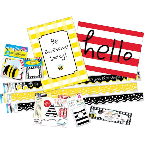 Barker Creek's Be Awesome Designer Decor Collection is perfect to fill all your classroom decorating needs Barker Creek bundled 10 of their bestselling products to bring you this Designer Classroom Set Create beautiful bulletin boards with the Motivational Posters, Letter Popouts, Accents and DoubleSided Scalloped Trim The doublesided scalloped trim can also be used to frame your doors, accent displays and special projects, decorate your office cubicle, jazz up your children's rooms at homethe possibilities are endless The Library Pockets have two selfadhesive peel stick strips on the back making them easy to adhere to file folders, binders, charts, signs, hallways, and doors Brighten up any space with the 4 Letter PopOuts Super chic and easy to read, they are perfect for your next project, presentation, report, poster, or display The name tags are so versatile Use them as name badges, of course, and also keep them handy for labeling just about everything you want to keep track of Think of all the fun ways you can use the beautiful name plates they are great for adding some posh to your learning environment Create memorable letters home, award certificates, invitations and more with the coordinating paper The motivational posters are simply stunning We all need a little boost sometimes something to stir our imaginations, broaden our horizons, bring our goals into focus, and motivate us to take the next step and our posters are perfect for this There are endless ways to use this set, it is up to your imagination The possibilities are endless Coordinating products available Search Barker Creek Buffalo Plaid Wide Stripes