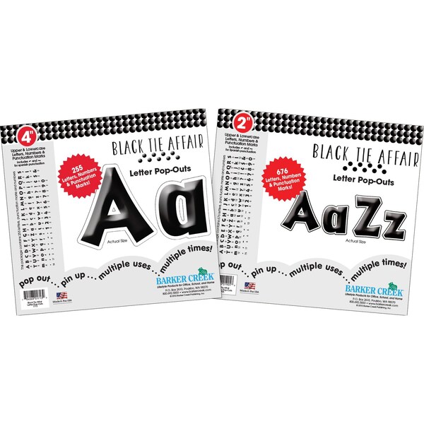 Barker Creek's Black Tie Affair 2 and 4 Letter PopOut Set will make your bulletin boards, posters, and displays POP with style and color The set includes two packages of Barker Creek's topselling letter popouts 2 Black Tie and 4 Black Tie The 2 Letter PopOuts are perfect for smaller spaces while the 4 PopOuts are great when you want to catch some eyes from afar This set includes a wellresearched assortment of 931 upper and lowercase letters, numbers and punctuation marks Spanish punctuation marks are also included 4 Letter PopOuts include 255 characters, while our 2 Letter PopOuts include 676 pieces Classy Beautiful Fun Easytouse Durable Fashionforward These are just a few compliments these beautiful letters have received Coordinating products available Search Barker Creek Black Tie Affair