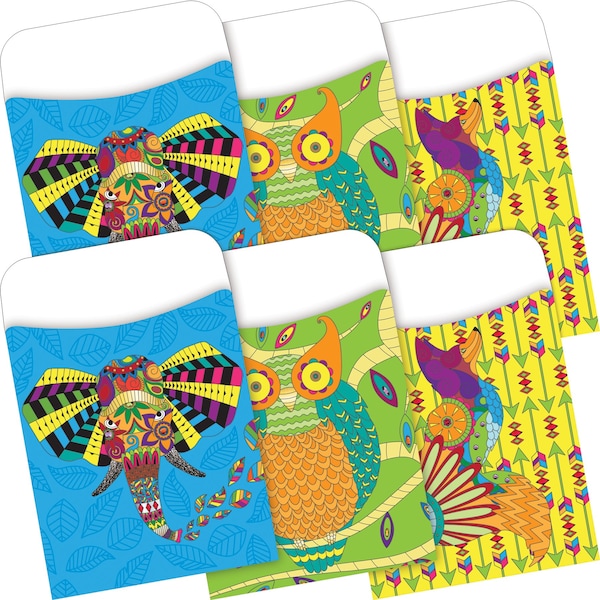 Barker Creek's Peel Stick Bohemian Animals Library Pockets are great for organizing flash cards, hall passes, file folder game pieces, spelling word lists, library cards, reading logs, and more This set includes 60 pockets twenty each of three colorful animal designs There is an elephant, owl and fox Each pocket has two selfadhesive peel stick strips on the back making them easy to adhere to file folders, binders, charts, signs, hallways, and doorsthe possibilities are limited only by your imagination You'll find dozens of creative uses for Barker Creek's versatile library pockets Suitable for all ages and grades Peel Stick Library Pocket measures 51875 H x 35 W Coordinating products available Search Barker Creek Bohemian Animals