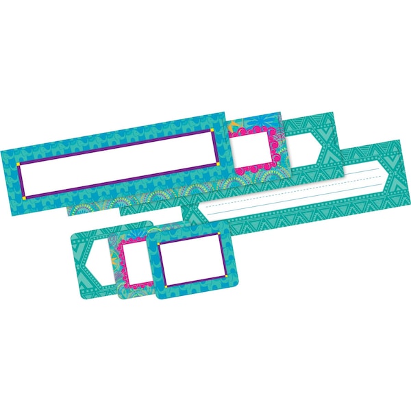 Barker Creek's Bohemian Name Tag Name Plate Set is sure to add a pretty touch to every learning environment Each set includes 45 selfadhesive labels 15 each of 3 colorful designs that measure 3 12 x 2 34 and 36 name plates 12 each of 3 designs that measure 12 long x 3 12 wide The brightly illustrated name tags are perfect for the first week of school, field trips, assemblies, special visitors, staff meetings and more They can also be used to personalize file folders, binders, and notebooks Use them as nameplates for your classroom library and to label learning center activities and supplies The doublesided name plates are incredibly versatile Use the side with rules when making name plates for student desks and lockers, creating word walls, making flashcards for spelling and vocabulary lists, and more Use the side without the rules for making beautiful bulletin board signs, labeling cubbies, and making hall passes Because they are doublesided, you can also hang them from the ceiling to identify learning centers, activity zones, library stacks The uses are limited only by your imagination Coordinating products available Search Barker Creek Bohemian