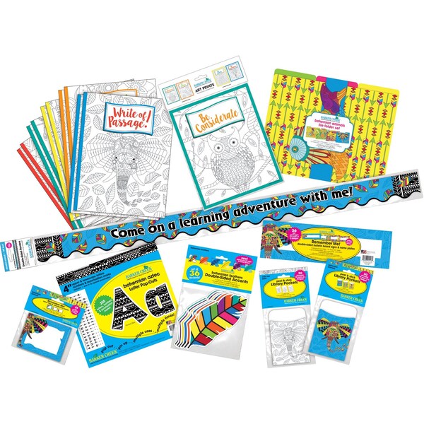 Barker Creek's Boho Chic Decor Collection is perfect to fill all your classroom decorating needs Barker Creek bundled 10 of their bestselling products to bring you this Decor Set Create beautiful bulletin boards with the letter popouts, doublesided accents, and doublesided scalloped trim The doublesided scalloped trim can also be used to frame your doors, accent displays and special projects, decorate your office cubicle, jazz up your children's rooms at homethe possibilities are endless The 10pack of Inspired Writing Journals will spark your students' creativity Barker Creek's beautiful Bohemian Animals LetterSized File Folders are an affordable way to organize your office, classroom, and home with style and flair Printed on durable 12 pt stock, the folders are 13 cut, and reversible Brighten up any space with the 4 Letter PopOuts Super chic and easy to read, they are perfect for your next project, presentation, report, poster, or display The Peel Stick Library Pockets are great for organizing flash cards, hall passes, file folder game pieces, spelling word lists, library cards, reading logsand more These name tags are stylish and so versatile Use them as name badges, of course, and also keep them handy for labeling just about everything you want to keep track of Think of all the fun ways you can use the beautiful name plates they are great for adding some posh to your learning environment The four beautiful 8 x 10 art prints included in this decor set feature inspirational quotes Perfect for the classroom, workplace or home Frame them or hang them as is There are endless ways to use this set, it is up to your imagination Coordinating product available Search Barker Creek Bohemian Animals