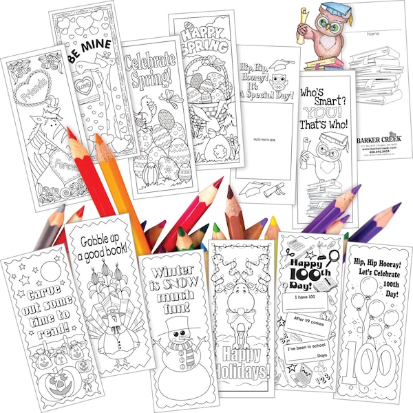 Celebrate special events and student achievements throughout the year with Barker Creek's Color Me Bookmark Set This set includes 360 bookmarks 30 each of 12 designs that are ready to be decorated Celebrate autumn, winter, 100th day, Valentine's Day, spring, and the end of the school year They are printed on durable card stock Kids love to color these bookmarks and turn them into minimasterpieces Punch a hole in the top and attach a tassel or a yarn loop, use glitter glue and wiggly eyes, the possibilities are limited only by your imagination Coordinating products available Search Barker Creek Color Me