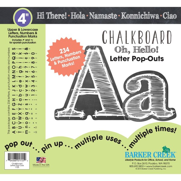 Barker Creek's Chalkboard Letter PopOuts will make your posters, signs, bulletin boards, and special projects pop Brighten up your next project with these fashionable bulletin board numbers, letters, and punctuation marksThis set includes a wellresearched assortment of 234 letters, numbers, and punctuation marks including Spanish Super chic and easy to read, they are perfect for your next project, presentation, report, poster, or display Use them to letter posters, create professional signs, make beautiful bulletin board displays, label presentation materials, make your Employee of the Month boards true eyecatchers, personalize your workspace, and more Uppercase Letters and numbers are 4 tall, making the board letters easy to see from a few yards away Coordinating products available Search Barker Creek Chalk