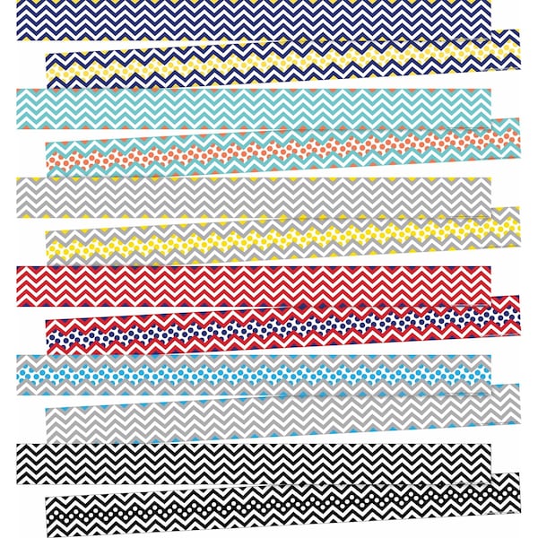 Barker Creek's Chevron doublesided trimmer set is perfect for any classroom Use all six of our doublesided Chevron trimmers at once in different areas of the classroom, or use just one at time and switch it up throughout the school year Our Chevron DoubleSided Trim are perfect for every occasion The colors featured in this set are navy with yellow, turquoise with tangerine, gray with yellow, red with navy, gray with light blue, and black These trimmers are sure to brighten up your room These durable, bright borders are printed on thick, coated paper Use Barker Creek's borders to brighten bulletin boards, frame doorways, define learning centers, and celebrate special events Coordinating products available search Barker Creek Chevron