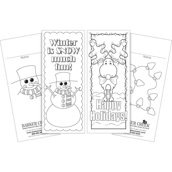 Barker Creek Celebrate Winter Bookmark features two bookmarks Winter is SNOW much fun and Happy Holidays Celebrate seasons, holidays, and special events with their darling new Bookmark Duets Each set includes 60 bookmarks 30 each of two designs Printed on durable card stock, they are printed on both sides and are designed to be decorated So break out the color pencils, crayons, glitter and glue Your children will love creating their own minimasterpieces Punch a hole in the top and attach a tassel or a yarn loop The possibilities are limited only by your imagination Coordinating products available Search Barker Creek Celebrate