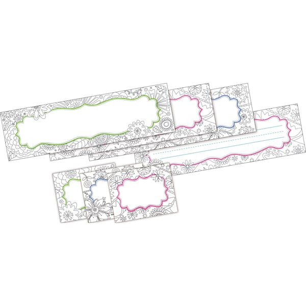 Barker Creek's Color Me In My Garden Name Tag Name Plate Set is sure to add a pretty touch to every learning environment and are designed to be colored Each set includes 45 selfadhesive labels 15 each of 3 colorful designs that measure 3 12 x 2 34 and 36 name plates 12 each of 3 designs that measure 12 long x 3 12 wide The name tags are perfect for the first week of school, field trips, assemblies, special visitors, staff meetings and more They can also be used to personalize file folders, binders, and notebooks Use them as nameplates for your classroom library and to label learning center activities and supplies The doublesided name plates are incredibly versatile Use the side with rules when making name plates for student desks and lockers, creating word walls, making flashcards for spelling and vocabulary lists, and more Use the side without the rules for making beautiful bulletin board signs, labeling cubbies, and making hall passes Because they are doublesided, you can also hang them from the ceiling to identify learning centers, activity zones, library stacks The uses are limited only by your imagination Coordinating products available Search Barker Creek Color Me
