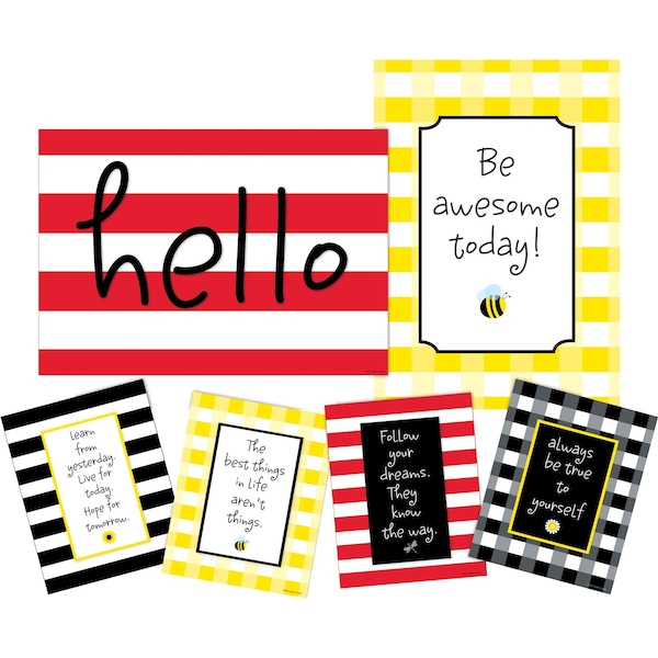 Barker Creek's Follow your Dreams Motivational Art Prints Posters Set includes two posters and four art prints Perfect for office, classroom, and home use, each poster measures 19 x 13 38 and each art print measures 8 x 10 They feature bright, ontrend designs with inspirational sayings or quotes Whether you choose to frame them or simply hang them as is, they are stunning The first poster features ontrend wide red and white stripes and boldly states a welcoming, Hello The second poster features yellow buffalo plaid says, Be awesome today This poster has an adorable bee at the bottom of the saying Each art features one of the following quotes Always be true to yourself The best things in life aren't things Follow your dreamsThey know the way Learn from yesterday Live for today Hope for tomorrow Coordinating products available Search Barker Creek Buffalo Plaid Wide Stripes