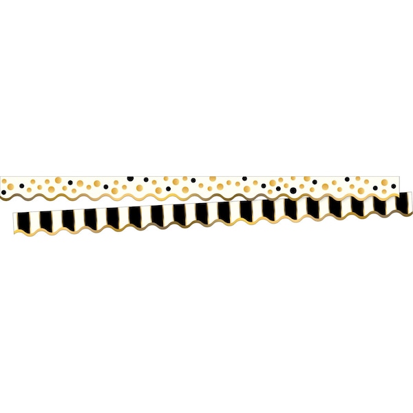 Barker Creek's Gold Bars DoubleSided Trim 2pack features a sporty scalloped edge This set includes 2 packages of Gold Scalloped trim Each package of trim includes 13 strips of trim measuring 2 14 high by 36 long that's 78 feet of WOW per package Raising the bar on the competition, Barker Creek's trim is also doublesided with coordinating designs printed on both sides That gives you twice as many decorating opportunities in a single package Side one features a very ontrend metallic gold and black dot pattern Side two features a coordinating design with metallic gold and black stripes Mix and match to your hearts content Border your bulletin boards, frame your doors, accent displays and special projects, decorate your office cubicle, jazz up your children's rooms at homethe possibilities are endless Coordinating product available Search Barker Creek Gold