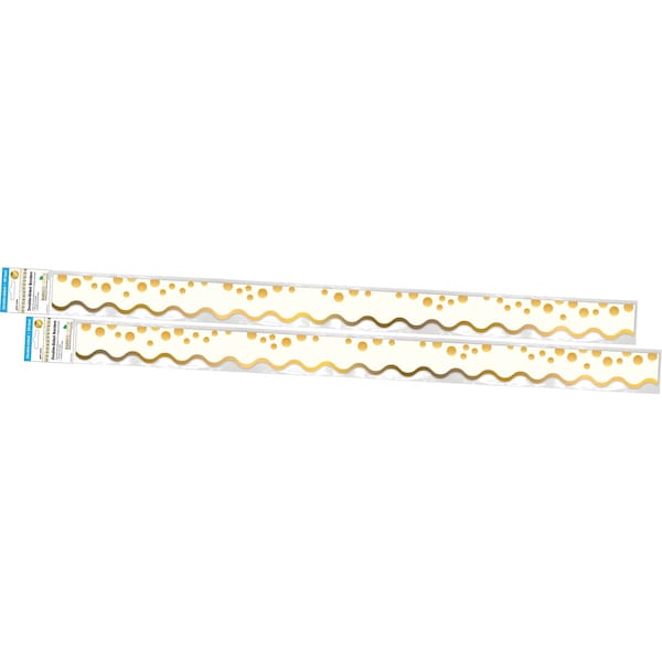Barker Creek's Gold Coins DoubleSided Trim 2pack features a sporty scalloped edge This set includes 2 packages of Gold Scalloped trim Each package of trim includes 13 strips of trim measuring 2 14 high by 36 long that's 78 feet of WOW per package Raising the bar on the competition, Barker Creek's trim is also doublesided with coordinating designs printed on both sides That gives you twice as many decorating opportunities in a single package Side one features a very ontrend metallic gold dot pattern Side two features a coordinating design with metallic gold and black stripes Mix and match to your hearts content Border your bulletin boards, frame your doors, accent displays and special projects, decorate your office cubicle, jazz up your children's rooms at homethe possibilities are endless Coordinating product available Search Barker Creek Gold