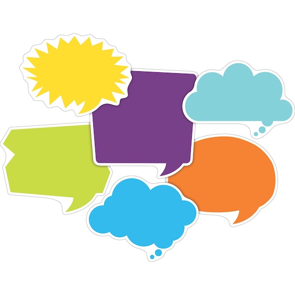 Barker Creek's Happy Talk DoubleSided Accents will spark your creativity and imagination These accents are doublesided to give you twice the decorating punch in a single package Imagine all the fun ways you'll be able to use these colorful accents that are diecut into six different speech bubble shapes Brighten bulletin boards Hang them over desks and learning centers Add a pop of color to your office cubicle Brighten up your home Put them in your windows Make amazing mobiles The set includes 36 speech bubble accents six each of six different designs Each Accent Measures Approx 55 wide by 55 high Coordinating products available Search Barker Creek Happy