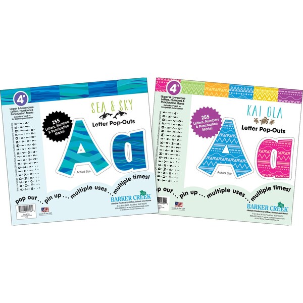 Barker Creek's Kai Ola Letter PopOut Set will make your bulletin boards, posters, and displays POP with style and color The set includes two packages of Barker Creek's topselling letter popouts Kai Ola and Sea Sky Each package includes a wellresearched assortment of 255 upper and lowercase letters, numbers and punctuation marks for a total of 510 characters in the set Each uppercase letter measures 4 high Spanish punctuation marks are also included Classy Beautiful Fun Easytouse Durable Fashionforward These are just a few compliments these beautiful letters have received Coordinating products available Search Barker Creek Kai Ola, Barker Creek Bohemian, and Barker Creek Sea Sky