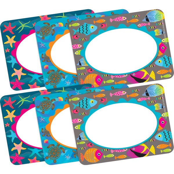 Barker Creek's Kai Ola Name tags and selfadhesive labels are perfect for all ages Package includes 90 multipurpose selfadhesive name tags 30 each of 3 designs The bright, colorful designs feature starfish, tropical fish, and sea turtles These name tags are perfect for the first week of school, field trips, assemblies, special visitors, staff meetings and more They can also be used to personalize file folders, binders, and notebooks The uses are limited only by your imagination These name tags measure 3 12 x 2 34 Coordinating products available Search Barker Creek Kai Ola