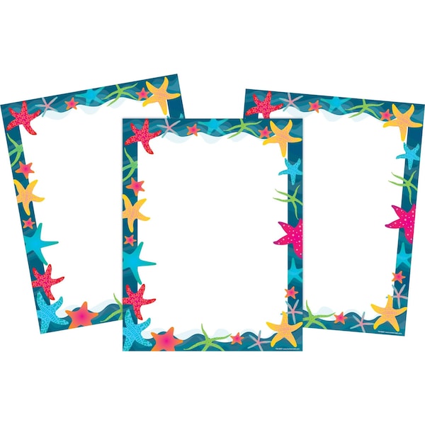 Barker Creek's new Kai Ola Starfish Computer Paper is affordable and beautiful It features a border of beautiful aqua and navy with vibrant starfish of various colors and sizes Use it to add a memorable touch to letters, design custom awards and certificates, add an extra wow to presentations and reports, create gorgeous invitations, make stunning bulletin boards, and so much more Set includes 150 8 12 x 11 sheets of decorative paper which is compatible with most laser printers Coordinating products available Search Barker Creek Kai Ola