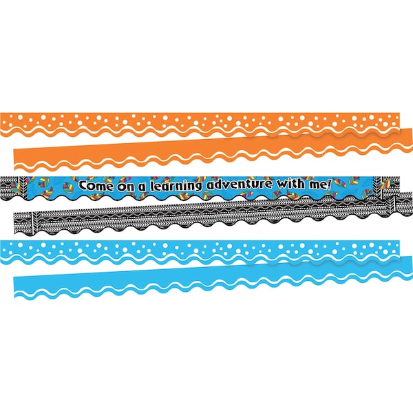Barker Creek's Learning Adventure DoubleSided Scalloped Trim set includes three packages of their top selling trim and is as stylish as can be Each package includes thirteen 36 long x 225 wide strips of trim that feature a sporty scalloped edge for a total of 117 FEET of trim per set Two of the packages of trim in this set feature a very ontrend design with dots and swirls with coordinating designs on both sides The colors of these two packages of trim are Happy Tangerine and Happy Pool Blue The third package of trim features a beautiful design with vibrant colored leaves and the saying, Come on a Learning Adventure with Me on the front The flip side features a black and white boho aztec coordinating pattern Mix and match to your hearts content Border your bulletin boards, frame your doors, accent displays and special projects, decorate your office cubicle, jazz up your children's rooms at home the possibilities are endless Coordinating product available Search Barker Creek Happy and Barker Creek Bohemian Animals