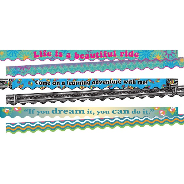 Barker Creek's Life Quotes DoubleSided Scalloped Trim set includes three packages of their top selling trim and is as stylish as can be Each package includes thirteen 36 long x 225 wide strips of trim that feature a sporty scalloped edge for a total of 117 FEET of trim per set The first package of trim features a beautiful design with vibrant colored leaves and the saying, Come on a Learning Adventure with Me on the front and the flip side features a black and white boho aztec coordinating pattern The second package of trim of trim features a lovely turquoise color with vibrant colored designs and the saying, Life is a beautiful ride on the front and the flip side features a colorful coordinating pattern The third package of trim features a lovely blue color with vibrant colored flowers and the quote If you dream it, you can do it by Walt Disney on the front The flip side features a colorful coordinating pattern Mix and match to your hearts content Border your bulletin boards, frame your doors, accent displays and special projects, decorate your office cubicle, jazz up your children's rooms at home the possibilities are endless Coordinating product available Search Barker Creek Bohemian, Barker Creek Nature's Colors, and Barker Creek Bohemian Animals