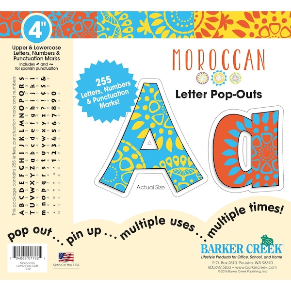 Barker Creek's Moroccan Letter PopOuts will make your bulletin boards, posters, and displays POP with style and color This set includes a wellresearched assortment of 255 letters, numbers, and punctuation marks including Spanish Each uppercase letter measures 4 high Classy Beautiful Fun Easytouse Durable Fashionforward These are just a few compliments these beautiful letters have received Coordinating products available Search Barker Creek Moroccan