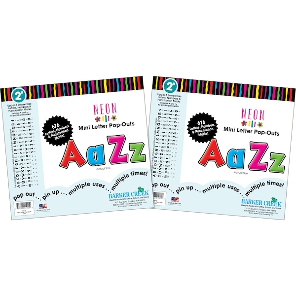 Barker Creek's 2 Neon Letter PopOuts will make your bulletin boards, posters, and displays POP with style and color The 2 Letter PopOuts are perfect for smaller spaces where the 4 Letter PopOuts won't fit This set includes a wellresearched assortment of 1352 upper and lowercase letters, numbers and punctuation marks Spanish punctuation marks are also included Classy Beautiful Fun Easytouse Durable Fashionforward These are just a few compliments these beautiful letters have received Coordinating products available Search Barker Creek Neon