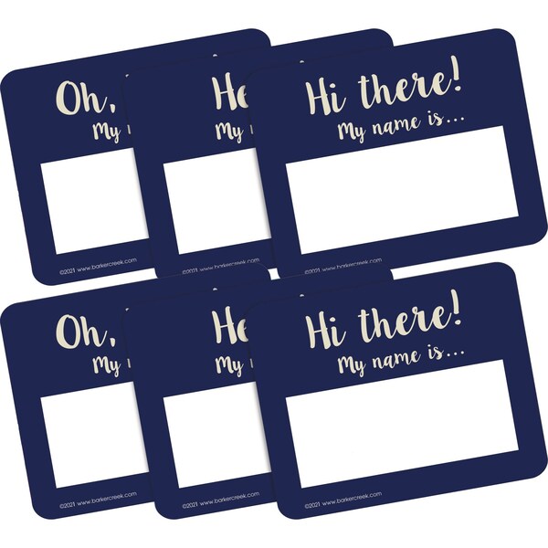 Barker Creek's Oh, hello Name tags and selfadhesive labels are perfect for all ages Package includes 90 multipurpose selfadhesive name tags 30 each of 3 designs The designs feature a lovely navy color and say 'Oh, Hello My name is', 'Hello My name is', and 'Hi there My name is' There is also a box to write in your name These name tags are perfect for the first week of school, field trips, assemblies, special visitors, staff meetings and more They can also be used to personalize file folders, binders, and notebooks These name tags measure 3 12 x 2 34 The uses are limited only by your imagination
