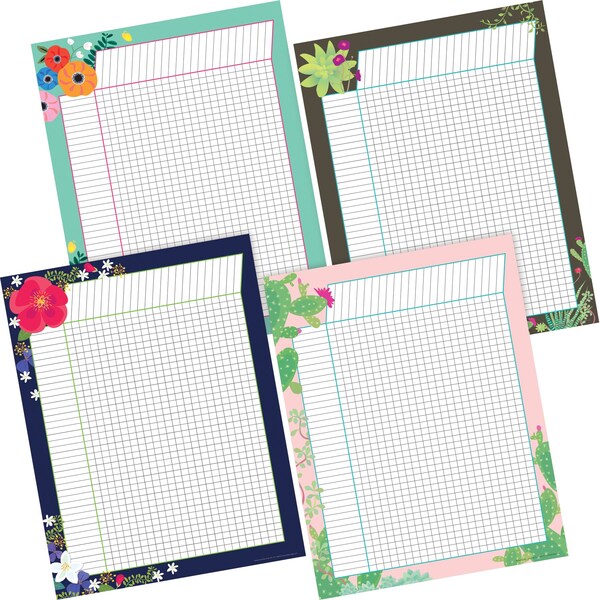 Keep progress organized in style with Barker Creek's Petals Prickles Incentive Chart Set These colorful incentive charts are ontrend and feature vibrant designs of beautiful flowers, cacti, and succulents They will help you to keep track of a student's progress or goals and encourage selfmanagement skills Each chart measures a generous 17 x 22 with 12 squares space for 40 student names and 24 assignments You'll find fun, reproducible activities on the back of all of four charts Coordinating products available Search Barker Creek Petals Prickles