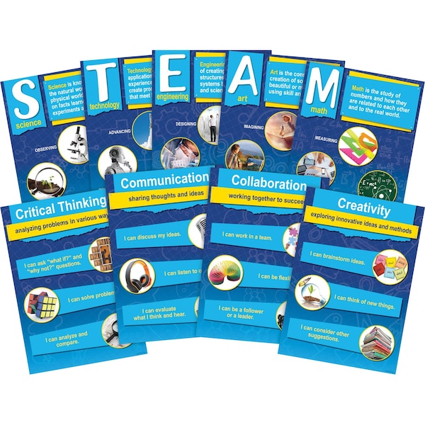 Barker Creek's STEMSTEAM Poster Set consists of 9 posters that visually support key STEMSTEAM concepts Why is it critical that our students be well versed in science, technology, engineering, the arts, and math The simple answer is that these disciplines pervade every aspect of our daily lives The first five posters focus on Science, Technology, Engineering, Art, and Math The remaining four posters focus on the Four Cs skills deemed, by educators and employers alike, as essential for Preparing 21st Century Students for a Global SocietyThe Four Cs, considered key components of a solid STEMSTEAM education, are Critical Thinking, Communication, Collaboration, and Creativity Each of the nine posters in this set measures19 high x 1338 wide