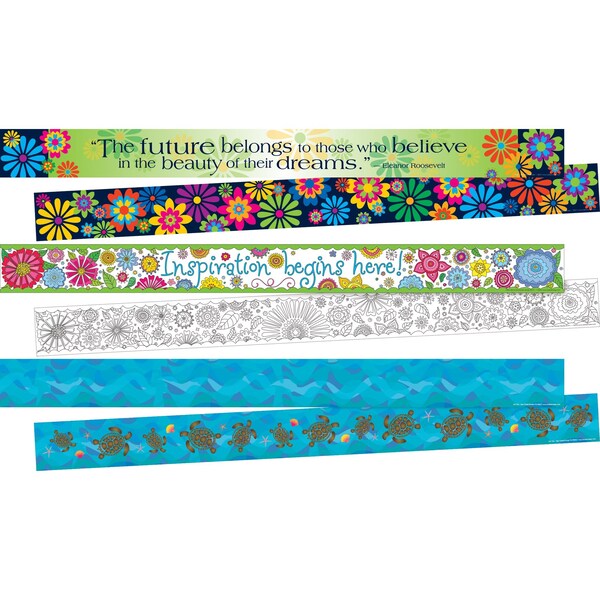 Barker Creek's Summer Fun DoubleSided Trim set includes three packages of their top selling trim and is as stylish as can be Each package includes twelve 35 long x 3 wide strips of trim for a total of 105 FEET of trim per set These packages of trim feature beautiful vibrant colors with lovely designs Side one of the first set of trim features beautiful, vibrant flowers of all shapes and sizes and the saying Inspiration begins here The flip side is for you to color in however you please Side one of the second set of trim features a quote by Eleanor Roosevelt, The future belongs to those who believe in the beauty of their dreams while the other side blooms with bright, cheerful flowers on a navy blue background The third set of trim features various shades of beautiful aqua swirls on one side while the other side features the same design along with sea turtles, shells and starfish Border your bulletin boards, frame your doors, accent displays and special projects, decorate your office cubicle, jazz up your children's rooms at home the possibilities are endless Coordinating product available Search Barker Creek Color Me, Barker Creek Kai Ola, and Barker Creek Italy