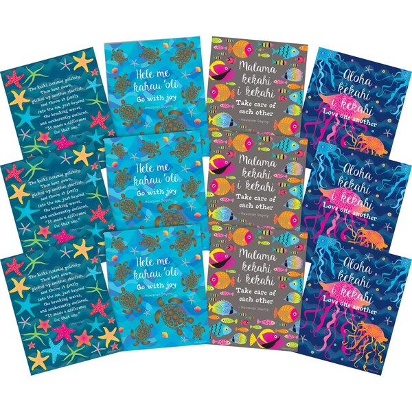 Barker Creek's Kai Ola Art Prints Set includes twelve 8 x 10 art prints three each of four prints These art prints are perfect for the classroom, workplace or home Frame them or hang them as is The designs feature beautiful jellyfish, starfish, turtles, and fish and have Hawaiian sayings and quotes on them The lovely starfish art print features part of the Hawaiian story THE STARFISH It says The keiki listened politely Then bent down, picked up another starfish, and threw it gently into the sea, just beyond the breaking waves, and exuberantly declared, It made a difference for that one The colorful turtle art print features the Hawaiian saying Hele me kahau 'oli Go with joy The vibrant fish art print features the Hawaiian saying Malama kekahi i kekahi Take care of each other The beautiful jellyfish art print features the Hawaiian saying Aloha kekahi i kekahi Love one another Coordinating products available Search Barker Creek Kai Ola