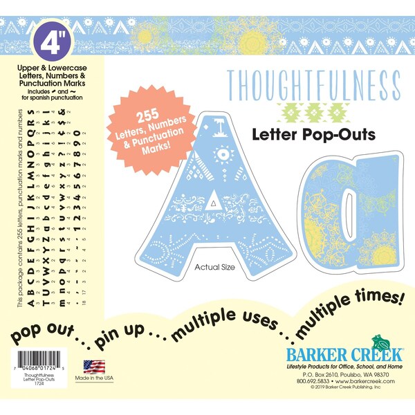 Barker Creek's Thoughtfulness Letter PopOuts will make your bulletin boards, posters, and displays POP with style and color The designs feature the calm color palette and ontrend mandala designs that were inspired by the thoughtfulness, mindfulness, and meditation trends This set includes a wellresearched assortment of 255 letters, numbers, and punctuation marks including Spanish featuring beautiful light blues with yellow and white designs Classy Beautiful Fun Easytouse Durable Fashionforward These are just a few compliments these beautiful letters have received Coordinating products available Search Barker Creek Thoughtfulness