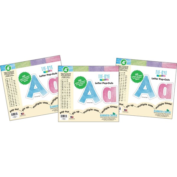 Barker Creek's TieDye Letter PopOuts 3pack will make your bulletin boards, posters, and displays POP The beautiful tiedye colors featured in this set are blue, purple, lime, and pink This set includes a wellresearched assortment of 765 letters, numbers, and punctuation marks including Spanish Classy Beautiful Fun Easytouse Durable Fashionforward These are just a few compliments these beautiful letters have received Coordinating products available Search Barker Creek TieDye and Ombre