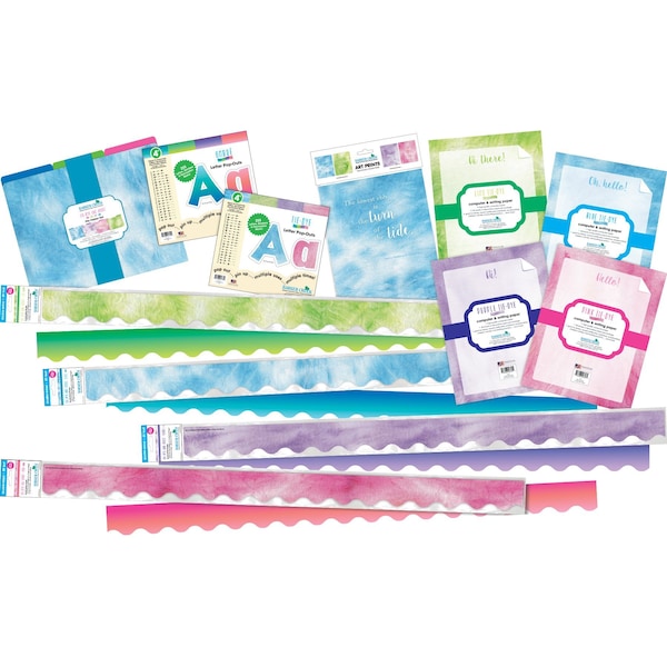 Barker Creek's TieDye and Ombre Curated Collection classroom set is perfect to fill all your classroom decorating needs Barker Creek bundled 12 of their bestselling products to bring you this Designer Classroom Set Create beautiful bulletin boards with the Letter Popouts, motivational art prints, and DoubleSided Scalloped Trim Set The doublesided scalloped trim can also be used to frame your doors, accent displays and special projects, decorate your office cubicle, jazz up your children's rooms at homethe possibilities are endless The LetterSized File Folders are an affordable way to organize your office, classroom, and home with style and flair Printed on durable 12 pt stock, the folders are 13 cut, and reversible Brighten up any space with the 4 Letter PopOuts Super chic and easy to read, they are perfect for your next project, presentation, report, poster, or display The Blue, Lime, Pink, and Purple TieDye Computer Paper is affordable and beautiful Use them to add a memorable touch to letters, design custom awards and certificates, or add an extra WOW to presentations and reports There are endless ways to use this set, it is up to your imagination The possibilities are endless Coordinating products available Search Barker Creek TieDye and Ombre