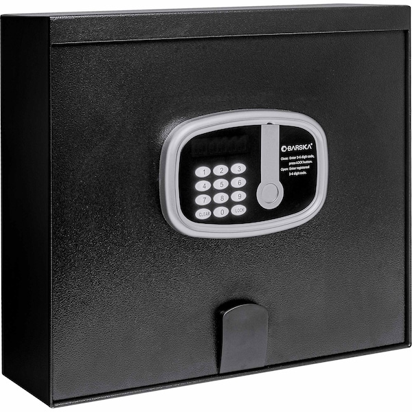 Keep your valuables such as travel documents, jewelry, cash, tablets and other small electronics locked and secured with the 0.5 Cu. ft Top Opening Hotel Safe by BARSKA. This safe features an Easy-to-Read ADA Compliant LED Keypad Display, Two Gas-Powered Lift Supports, Two Solid Steel Motorized Locking Bolts, and a Keypad Memory that can store one 3-6 digit code. And the optional pedestals are great in gaining more accessibility for the user. The keypad has comprehensive audit trail capability reducing fraudulent liability claims. Each safe has a built-in smart chip that records when the safe was opened, and how it was opened. This recorded information is easily downloaded using our handheld CEU override device a CEU unit will be included with every 100 units ordered or it can be purchased separately.Keypad Memory Can Store one 3-6 Digit CodeTwo Solid Steel Motorized Locking BoltsTwo Gas-Powered Lift SupportsEasy-to-Read ADA Compliant LED Keypad DisplayComprehensive Audit LogThree Override Methods; Master Code, CEU, and Spare KeysLow Power Consumption, Battery Life Over 1 YearPre-Drilled Holes Allow The Safe to Be Mounted into the Floor, On a Shelf, or a CountertopIncludes Set of Emergency Back-Up Keys, Mounting Hardware