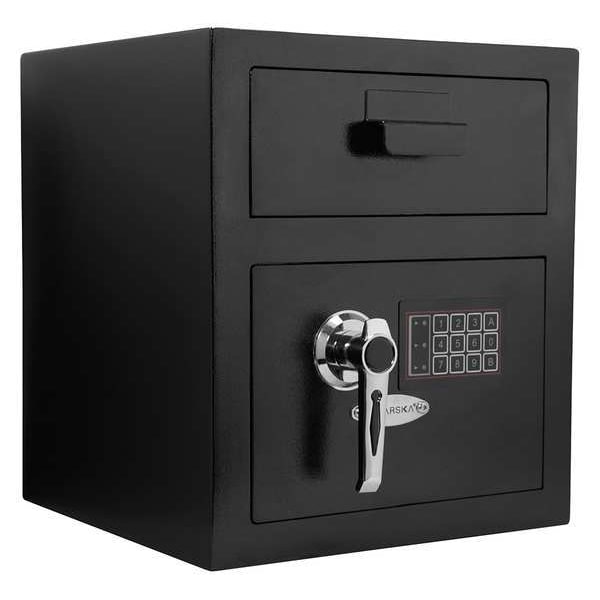 Cash Depository Safe, Black, Net Weight 41.75 lb, Capacity 0.72 cu ft, Not Rated Fire Rating, Water Endurance Not Specified, Material Steel, Finish Matte, Max. User Codes 2, Number of Shelves 0, Number of Drawers 0, Lock Style (2) Deadbolt Lock, Digital Keypad, Number of Bolts 2, Outside Height 15 33/100 in, Outside Width 19 in, Outside Depth 13 1/2 in, Inside Height 7 3/5 in, Inside Width 13 1/2 in, Inside Depth 11 1/2 in, Door Plate Thickness 2 mm, Wall Thickness 2 mm