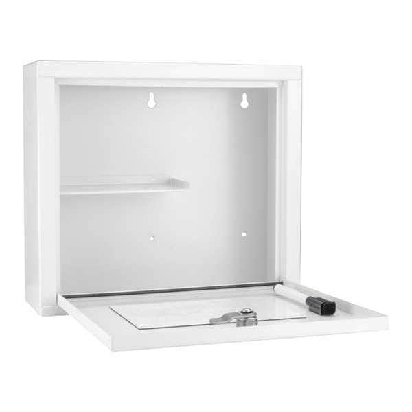 Supply Cabinet, Frame Assembled Assembled, Number of Shelves 1, Antimicrobial No, Cabinet Color White, Cabinet Material Steel, Cabinet Storage Components Shelves, Drawer Height Not Applicable, Drawer Width Not Applicable, Mobility Stationary, Number of Doors 1, Overall Depth 3 1/4 in, Overall Height 9 1/2 in, Overall Width 10 5/8 in, Shelf Width 6 1/8 in, Mounting Location Wall, Door Opening Bottom Hinged, Door Type Fold-Down, Lock Type Keyed, Overall Load Capacity Not Rated