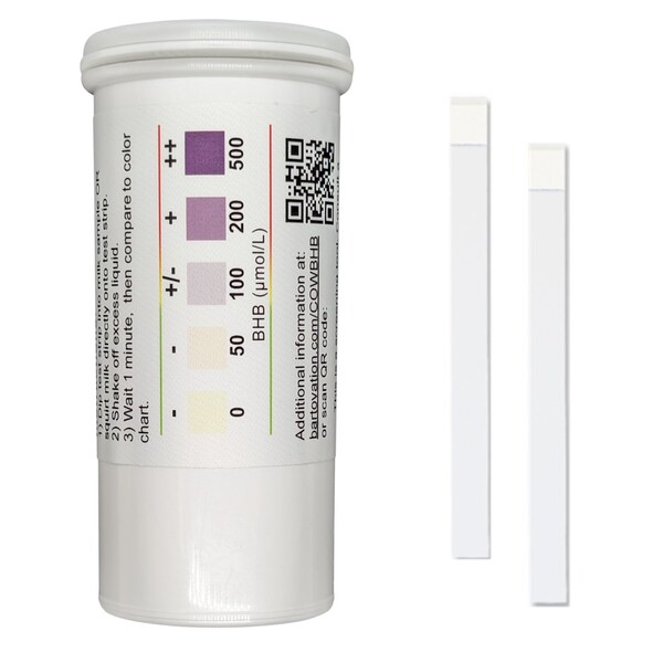 This reliable on-farm test can be used to detect subclinical ketosis in individual cows before it progresses and causes both harm to your cows and profits. This test specifically tests and quantifies BHB, a common ketone that is formed during subclinical ketosis. This semiquantitative dipstick test can simply be dipped into fresh foremilk, shaken, and compared to the provided color chart after just one minute. Instructions for use: Normal udder prep procedure prior to milking (usually involves cleaning, disinfection, specific wait time prior to applying milking units for letdown). Strip each quarter 3-5 x or whatever the farm’s procedure is for initial milk discard, After the initial discard stripping, use test as directed, where users can either strip milk directly onto the test pad or dip the test into a vial of milk (testing quarters or a composite sample from a vial), Shake off excess milk, and Compare test strip to color chart according to instructions. Note: Avoid using test strips that have discolored after extended storage. The reagent pad on unused test strips should be yellow. Interpretation of results: BHB Concentration in milk Indication 0-99 μmol/L Normal (-) 100-199 μmol/L Weak Positive (+/-) 200-499 μmol/L Positive (+) 500+ μmol/L Highly Positive (++) This test is intended solely for the estimation of ketones in fresh cow milk. The test is not a laboratory reference method and should not be used as a diagnostic test. Consult a veterinarian before starting any treatment. This test is not intended for use on humans. Bartovation products are not approved for use as medical devices. Products and product information is for informational purposes only and not intended for use to diagnose, treat, cure or prevent any medical condition. Consult a medical doctor when needed.