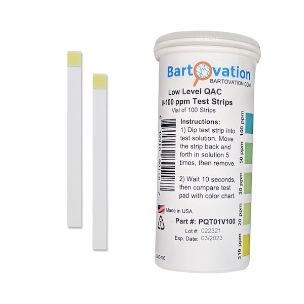 Determines quaternary concentrations less than 100 ppm in less than one minute Every vial comes with 100 easy to use pre-cut strips Comes in a portable moisture resistant desiccated vial ‚ protecting it from the elements and maximizing shelf life Has easy to use water resistant color chart and instructions printed on bottle Perfect for testing residual Quaternary Ammonia Check for residual levels of QAC with the Low Level QAC Test strip (Quaternary Ammonium Compounds). This strip is calibrated at 10, 20, 50 and 100ppm. The color block for 10ppm is actually ≤10ppm, but the color change from 0-10 is so insignificant, it’s difficult to see the difference. Instructions: Remove one test strip from the vial, being careful not to touch the test pad with your fingers. Dip the test strip into the solution being tested and move back and forth 5 times, then remove. Compare the test strip to the color chart after 10 seconds. To test for residues on surfaces wet the strip's testing pad with water (distilled if available) and press against the surfaces of fruits, vegetables, cutting boards and utensils, etc. for at least 10 seconds, then compare against the color chart.