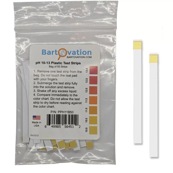 This pH 10-13 test strip is a narrow range test for strong bases and highly alkaline materials with increments of .5 pH units.
