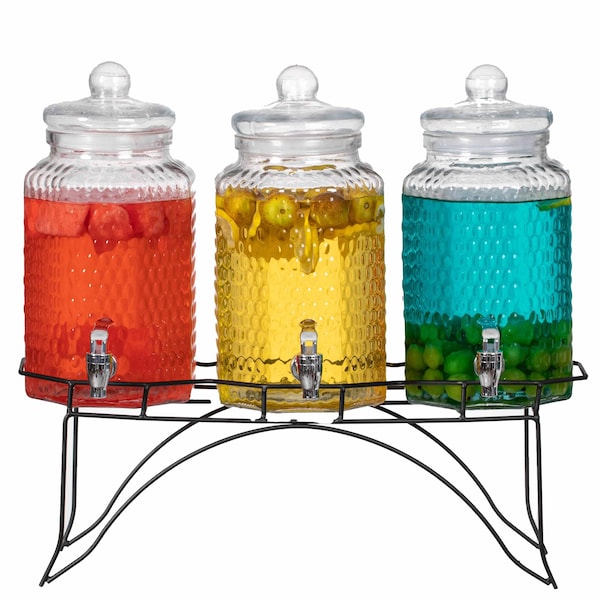 Get ready to party with our versatile 3-piece set of glass drink dispensers, designed to be 100% leak-proof and easy to refill. Whether youre hosting a summer bash, birthday celebration, bridal shower, or barbecue, these drink dispensers for parties are the perfect addition to your event. Featuring a sturdy stand and a stainless steel spigot, our glass jars combine both functionality and style, making them ideal for serving a wide range of beverages. Perfect for indoor and outdoor events, this dispenser set is a must-have for any occasion. Whether you're hosting a casual family gathering, a lively party, or a sophisticated tea party, these multifunctional water containers cater to all your beverage needs. They can house various drinks side by side, from refreshing orange juice and apple juice to tart cranberry juice, adding an elegant touch to your drink service. Designed for use at parties, casual dining in bars and restaurants, or family business events, our glass jar dispensers enhance your kitchen by adding aesthetic appeal and organization, while providing convenience for serving drinks during gatherings. Use them for festive occasions or even a charming lemonade stand, and watch them become a focal point of your decor. With their stylish design and practical features, our 3-piece set is the ultimate solution for serving drinks at any gathering, ensuring your guests savor every sip!