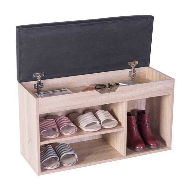 Combine comfort and organization with this wooden shoe Cubicle storage bench. The storage bench has 3 open compartments to store of various size shoes and boots. Top seat offers a soft cushion to sit on and opens up to reveal extra interior storage space to make entryways and mudrooms organized and comfortable. Welcome home.