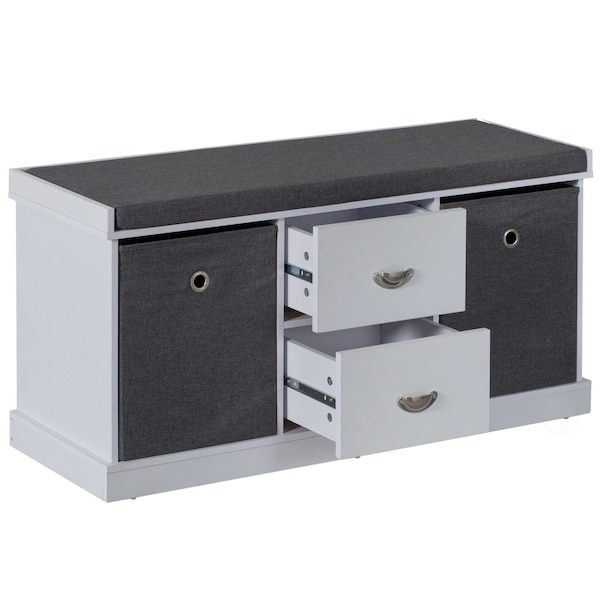 White Shoe Storage Bench with Wooden Frame, 2 Drawers, Foldable Baskets and Comfortable Gray Cushion